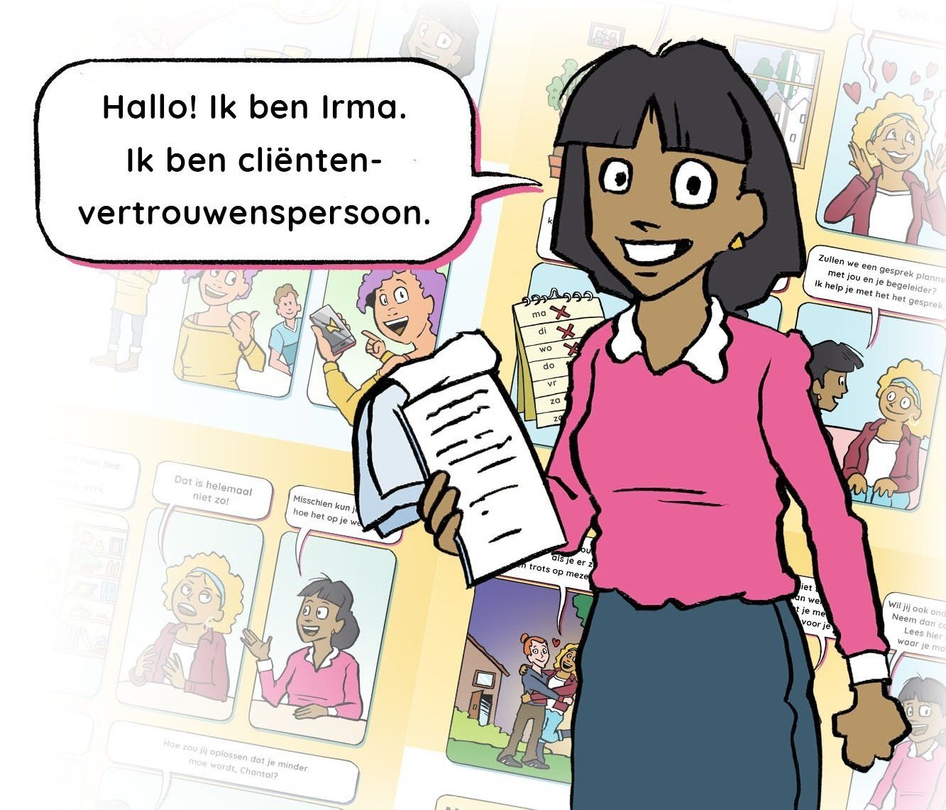 In de stripverhalen over cliëntenvertrouwenspersoon Irma, wordt aan de hand van praktijkvoorbeelden helder uitgelegd wat de cliëntenvertrouwenspersoon tegenkomt.